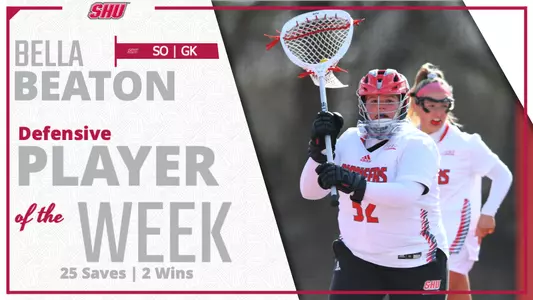 In wins over Bryant and Wagner, Beaton recorded 25 saves, seven ground balls and three caused turnovers. She started with 13 saves in the win at Bryant and produced 12 saves and five ground balls in the victory at Wagner. It was SHU's first win against the Seahawks since 2014.